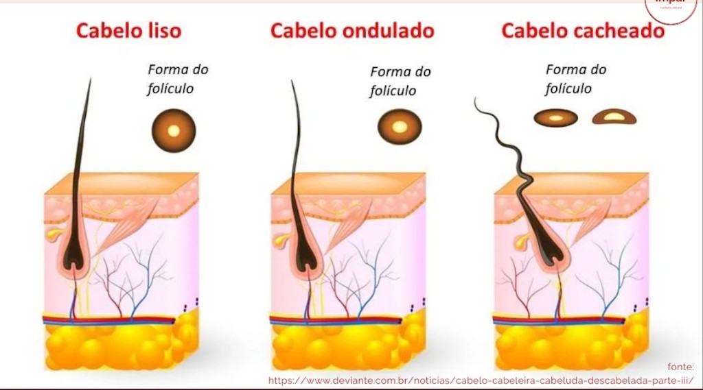 O formato e inclinação dos folículos pode ter a ver com a curvatura dos seus fios: "Se os folículos são simétricos, o cabelo nasce liso, enquanto que se os folículos são assimétricos, eles produzem fios em formato oval que tendem a enrolar enquanto crescem. (...) Quanto mais vertical o folículo for, mais redondinho será o formato da saída do fio e, com isso, mais liso o cabelo. Por outro lado, quanto mais inclinado o folículo, mais achatado será o formato da saída do fio. Além da forma do fio, o fato do folículo sair em um ângulo do escalpo, faz com que o cabelo precise se curvar para sair e por isso tende a cachear. Portanto, quanto mais o folículo for inclinado, mais cacheado será o cabelo até chegar ao crespo" (Mantovani, 2019).