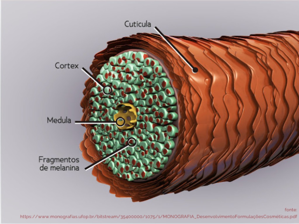 Lembrando: a haste capilar é dividida em três regiões principais: cuticula, córtex e medula.
