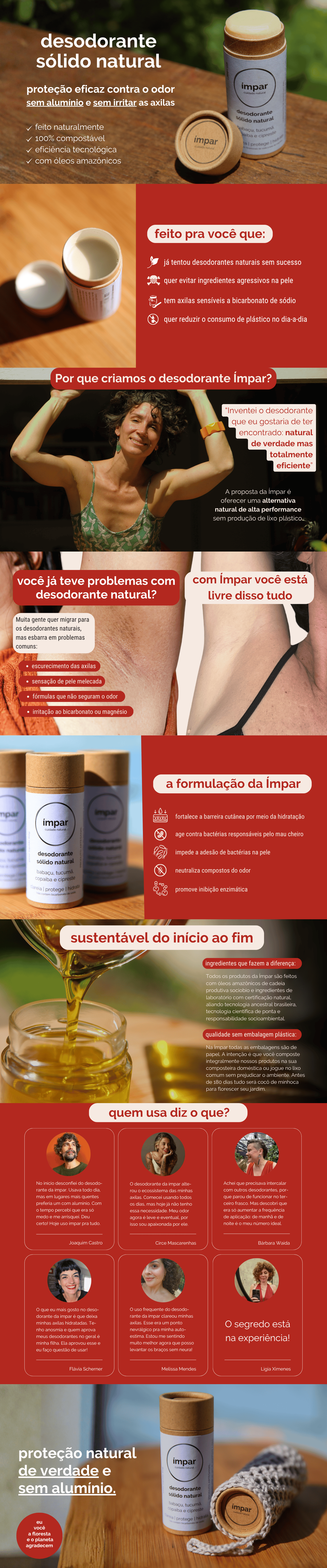 Composição INCI: euphorbia cerifera wax, caprylic/capric triglyceride, cetyl alcohol, tapioca starch , glycerin, copaifera officinalis resin oil, triethyl citrate, potassium alum, orbignya oleifera seed oil, zinc oxide, glyceryl caprylate, zinc ricinoleate, astrocaryum tucuma seed butter, astrocaryum murumuru seed butter, lecithin, sorbitan caprylate, propanediol, benzoic acid, tocopherol, copaifera officinalis resin oil, cupressus sempervirens oil, lavandula hybrida abrialis oil, thymus vulgaris flower/leaf oil, limonene, linalool.